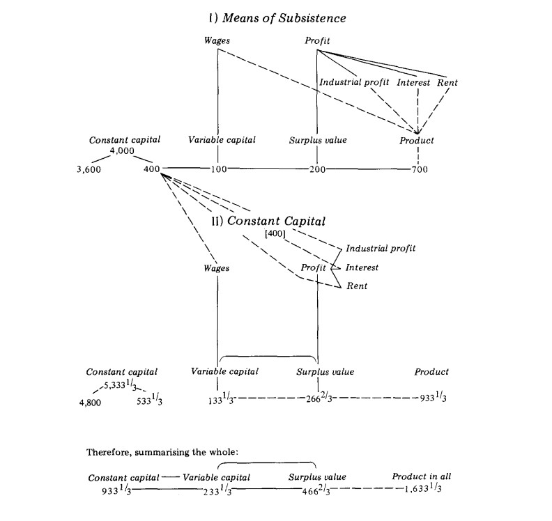 The variable capital of 133 1/3 is paid out in wages (money), and 133 1/3 is drawn with this money from the total product of class I. Thus 133 1/3 of the money of class II flows to class I, and products to the same value flow from class I to class II. The surplus value of 266 2/3 is paid in money as interest and rent, and a quantity of the products of class I is bought with this money. This sum of money together with the money that has flowed back from the wages, interest and rent of class I and the wages of class II is more than sufficient to provide class I with the 400 in money needed to replace class I's constant capital of 400 and to allow class II to draw means of subsistence from the total product of class I for its industrial profit. The result is that the whole of the product [of class] I has passed into the consumption fund, and 400 of the total product of class II has passed into class I in replacement of its constant capital, but class II, on the other hand, needs 533 1/3 for the replacement of its own constant capital.